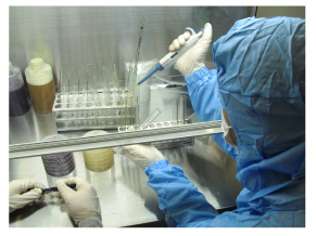 クリーンルームに設置されたクリーンベンチでNS乳酸菌の培養をする技術者。技術開発の中心となる中国人技術者(工程師)。